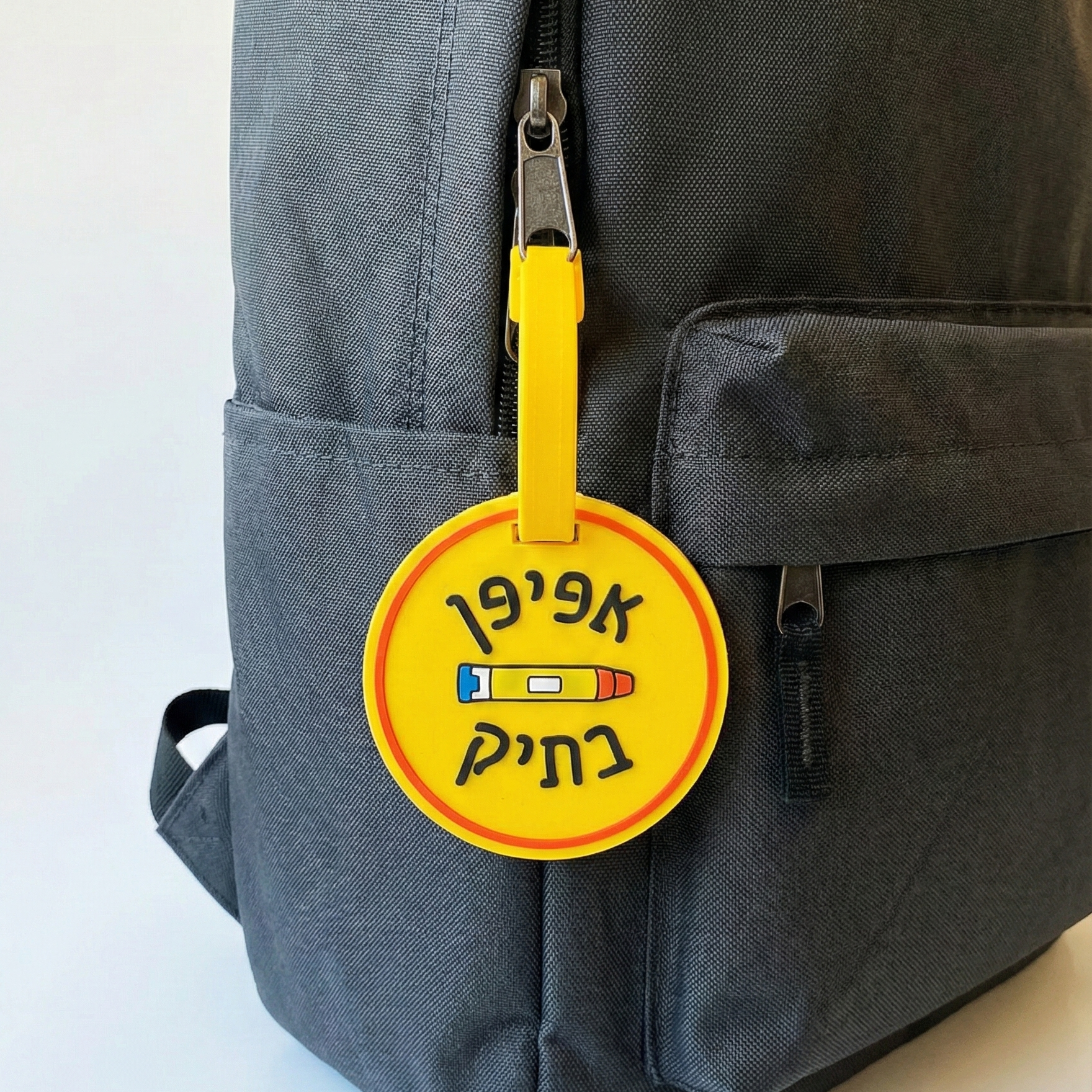 תגית זיהוי עגולה, ברורה ועמידה המיועדת לחיבור לתיק בית ספר, תיק גן או תיק טיולים. התגית משמשת כסימון ויזואלי בולט, ובצדה האחורי קיים מקום ייעודי לרישום פרטים אישיים חיוניים ליצירת קשר וזיהוי מהיר.