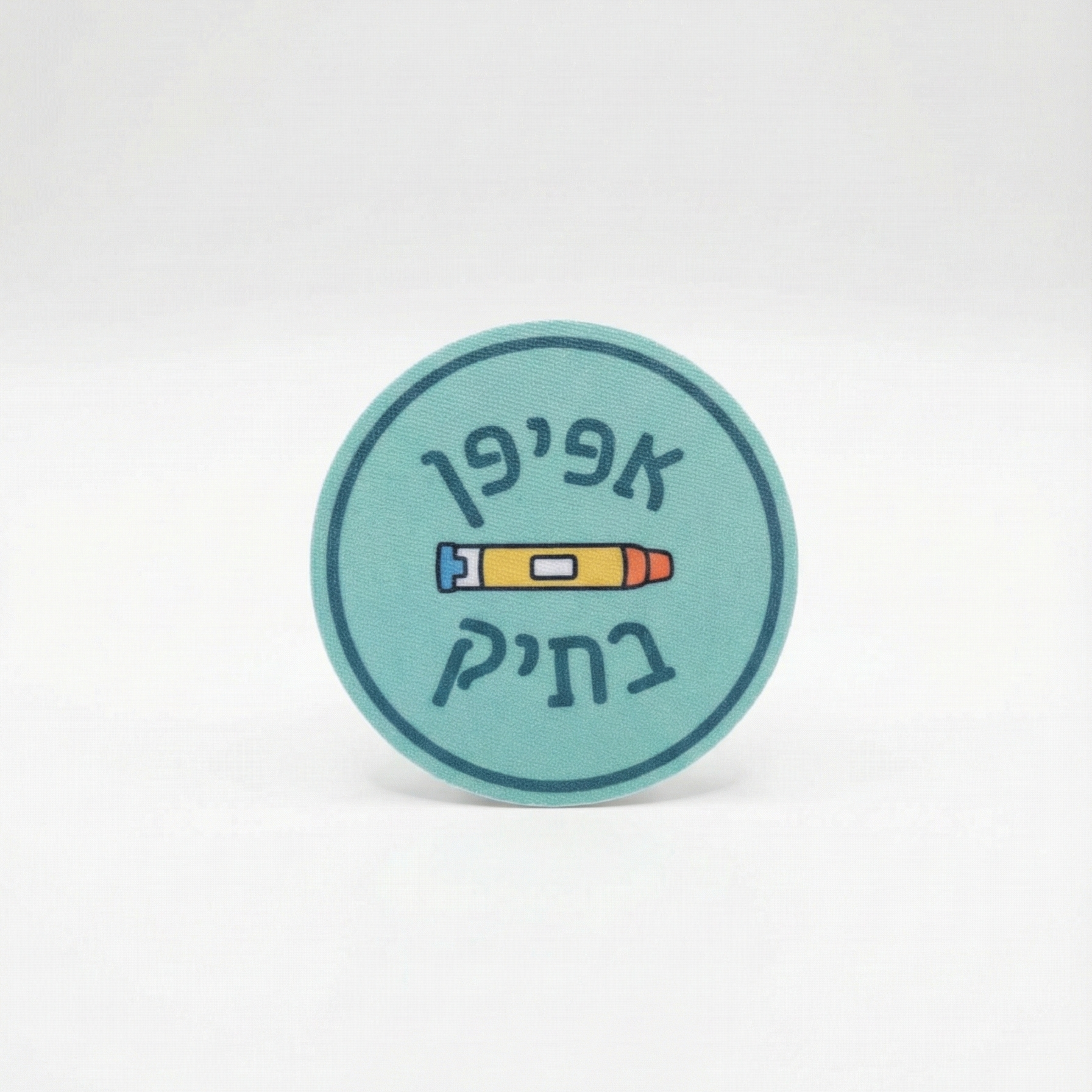 - עיצוב עגול בצבע טורקיז/תכלת עם כיתוב "אפיפן בתיק" ואיור מזרק.