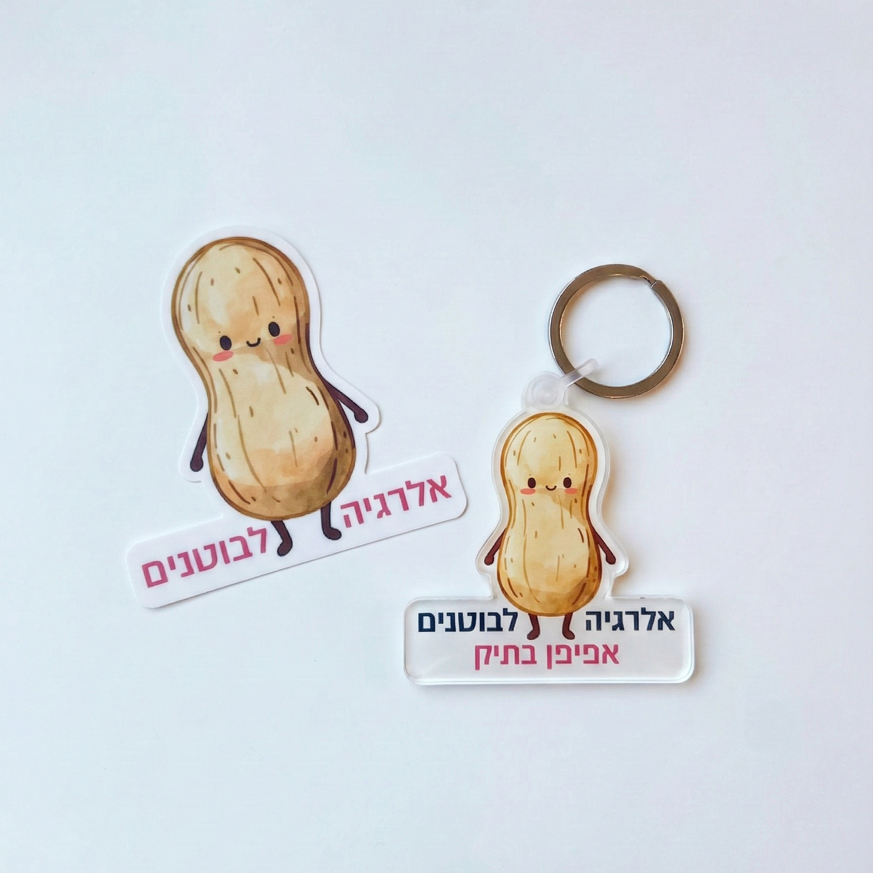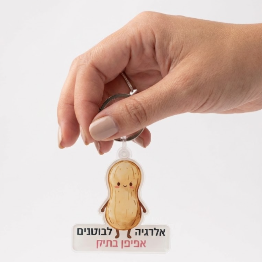 מחזיק מפתחות אקריליק המשמש לסימון אלרגיה לבוטנים וציון מיקום מזרק האפיפן. פתרון ויזואלי המאפשר לזהות בקלות את הציוד של הילד/ה באמצעות איור הבוטן והכיתוב הברור "אפיפן בתיק".